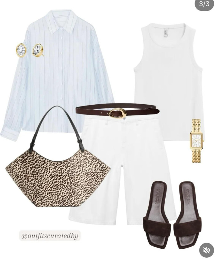 继续保持白色及膝短裤的干练,这次换成冰岛蓝的细条纹衬衣,豹纹扇形包虽然只是小细节,却是点亮基础款搭配的亮点,真的好看。