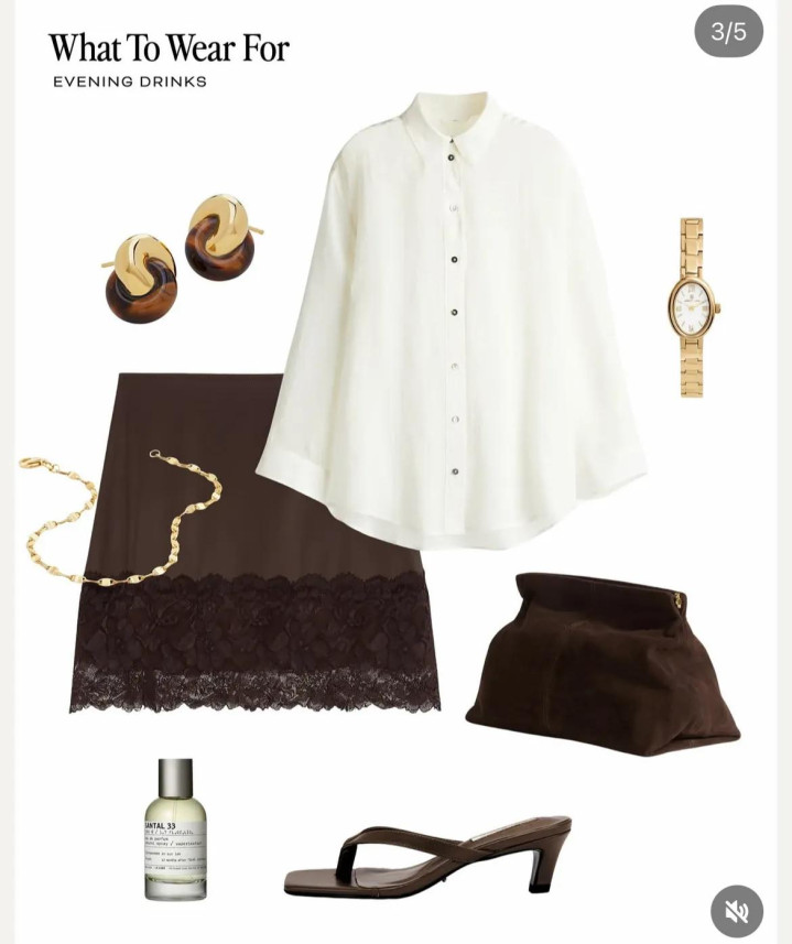 蕾丝元素继续用,深巧克力色A字短裙,用蕾丝图案一收边,就有了俏皮感。用下摆弧线的白色衬衫一搭。耳边咖色和金色拼接的耳环是呼应的小心机,美出法式女郎的魅力。