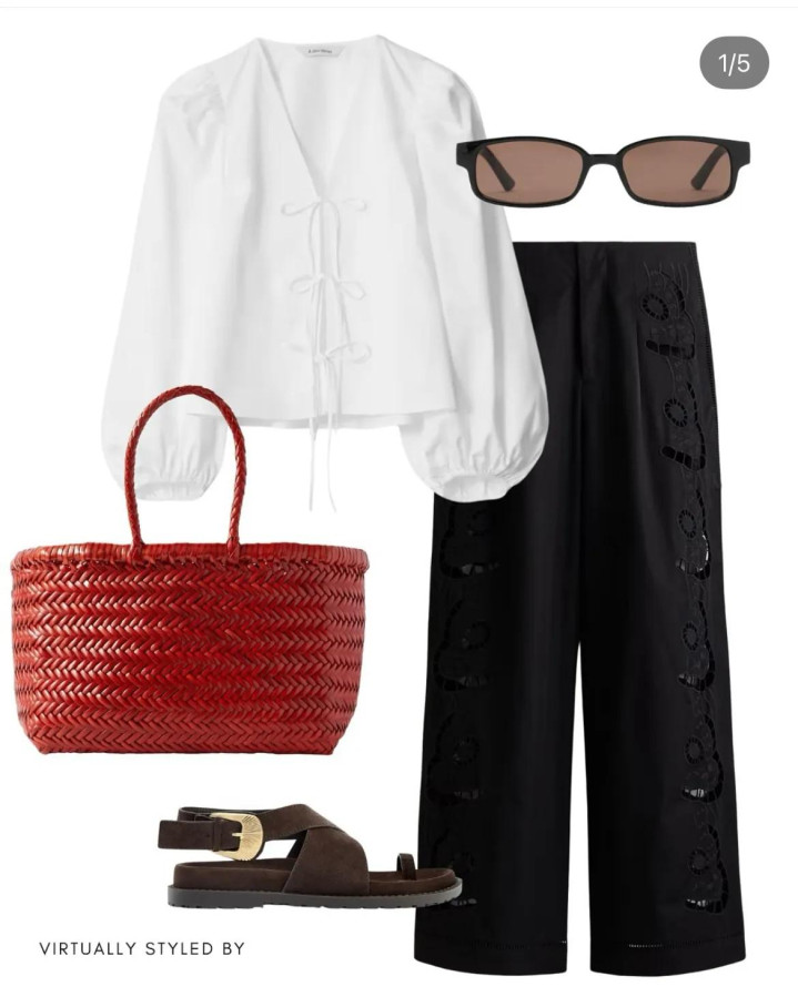 依然是羊腿袖,配合细带V领的白衬衫,让白衣黑裤也能告别刻板印象。玫瑰红单肩包更让人眼前一亮。