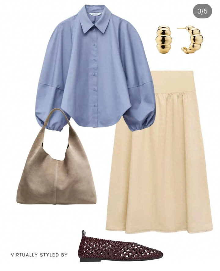 羊腿袖一加入,衬衫就多了古典味。再搭一条牛油黄的伞型半裙,轻盈穿出优雅感。