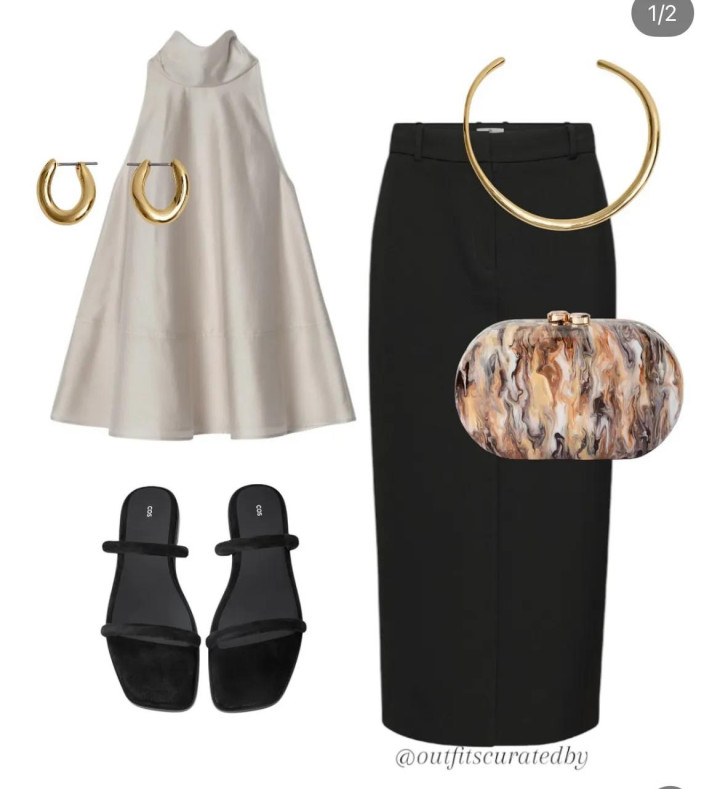 经典的包臀裙,一穿就有优雅OL的范儿,再搭起三角形款的上衣,小领口配自然蓬起的衣摆,非常有几何感的美。而淡雅香槟银配纱质面料,散发贵气美。这一身搭配真的很适合自信有魅力的姐姐。
